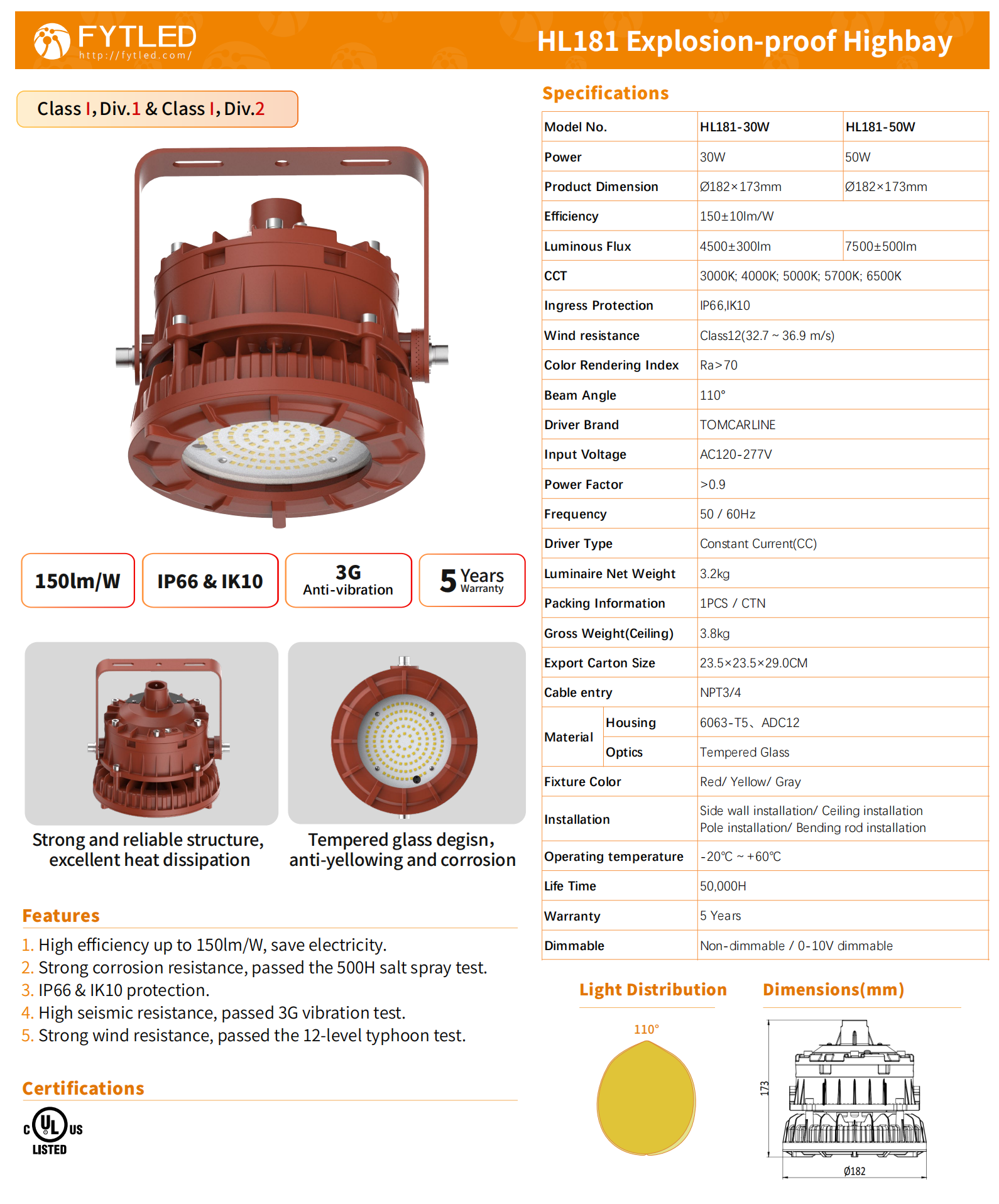 HL181圆形防爆灯,专门针对具有潜在爆炸威胁的工业领域照明进行设计, 主要用于采矿巷道,煤粉工厂等工作场地照明, 现场要求产品满足防爆欧规、美规要求, 且长期在户外潮湿环境下使用。 已通过认证:IECEx;ATEx;PCEC;UL