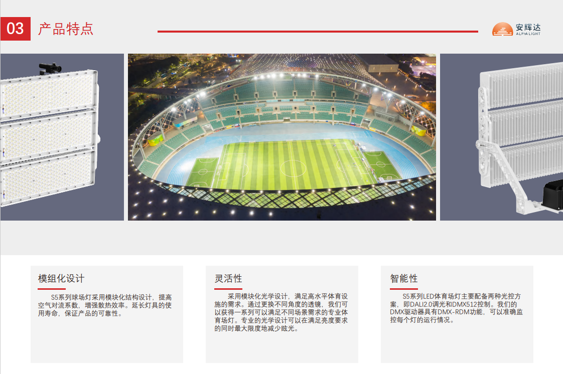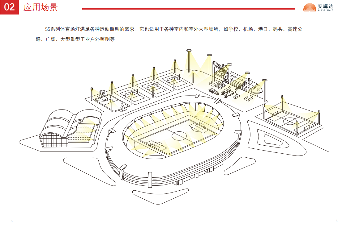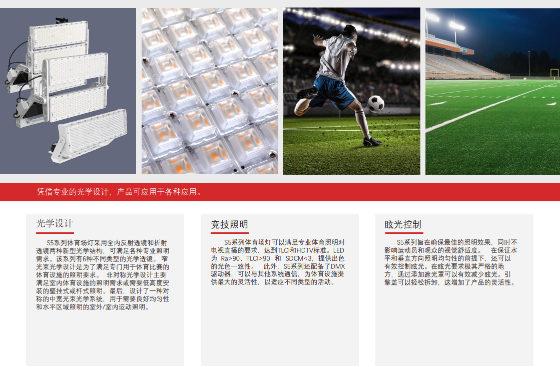 S5 LED 球场灯旨在满足专业比赛的最高照明性能标准。S5 系列 提供在水平和垂直方向上具有出色光分布的解决方案,确保裁判、球 员和摄像机的完美可视性,并满足观众的最大视觉舒适度。