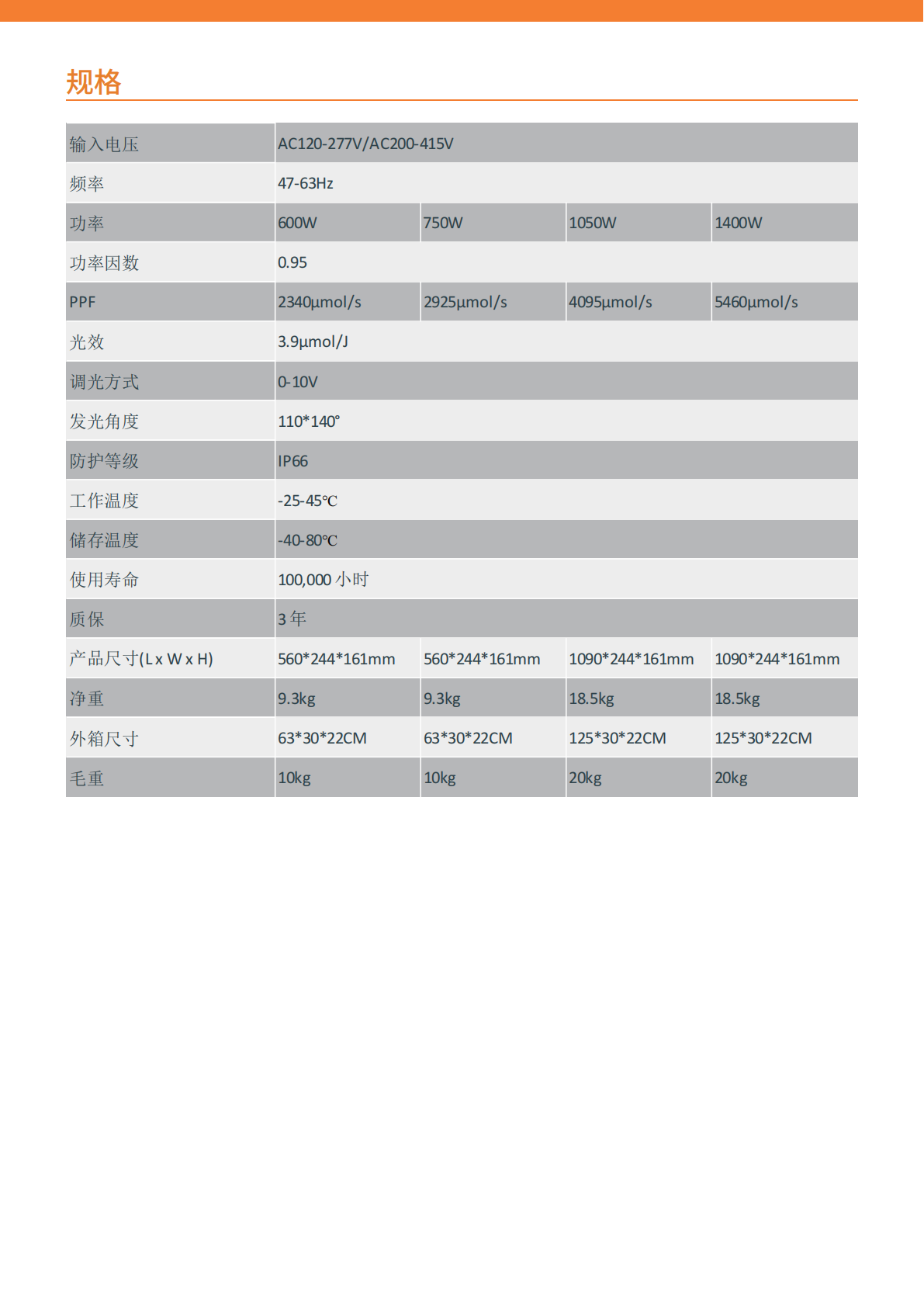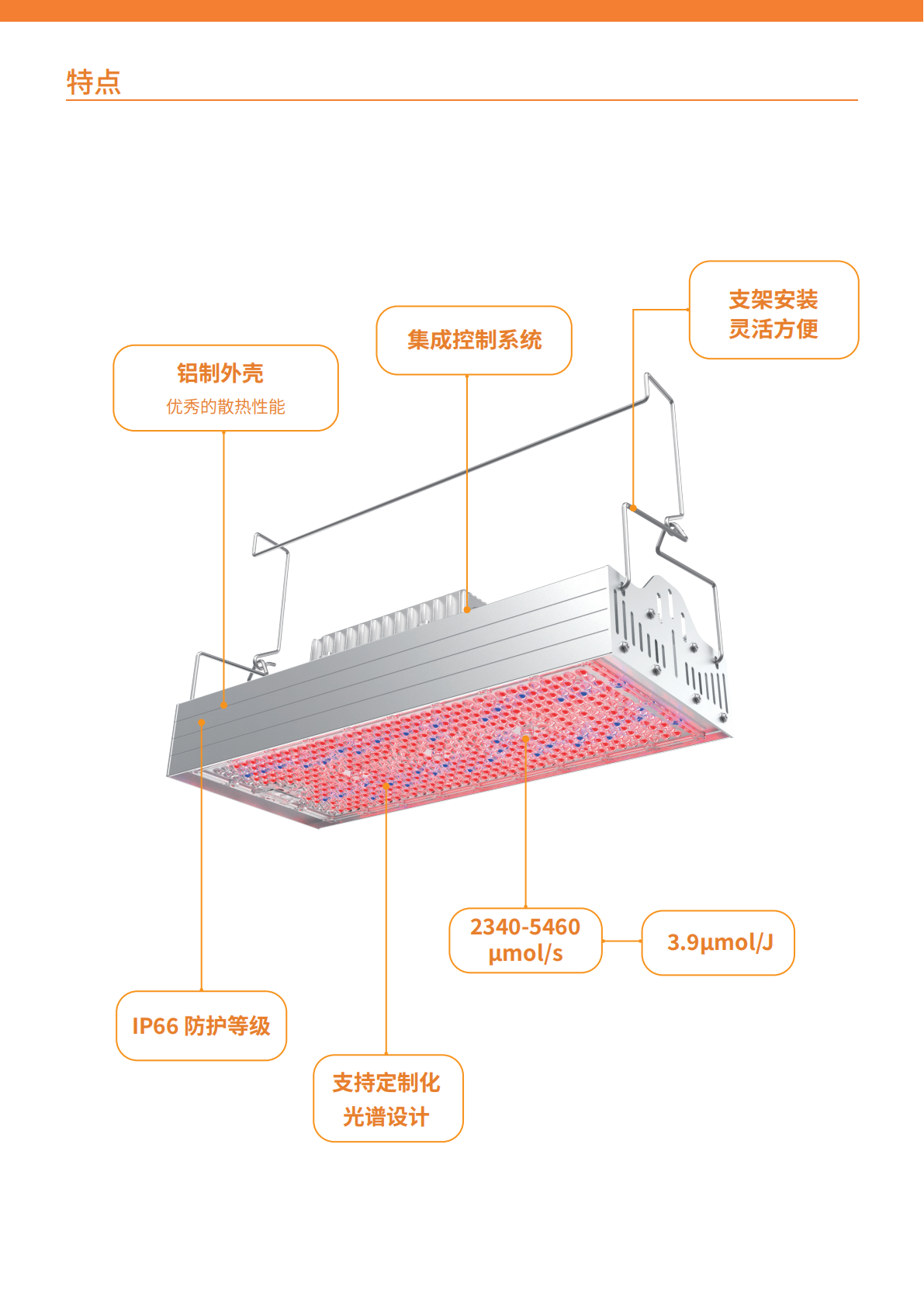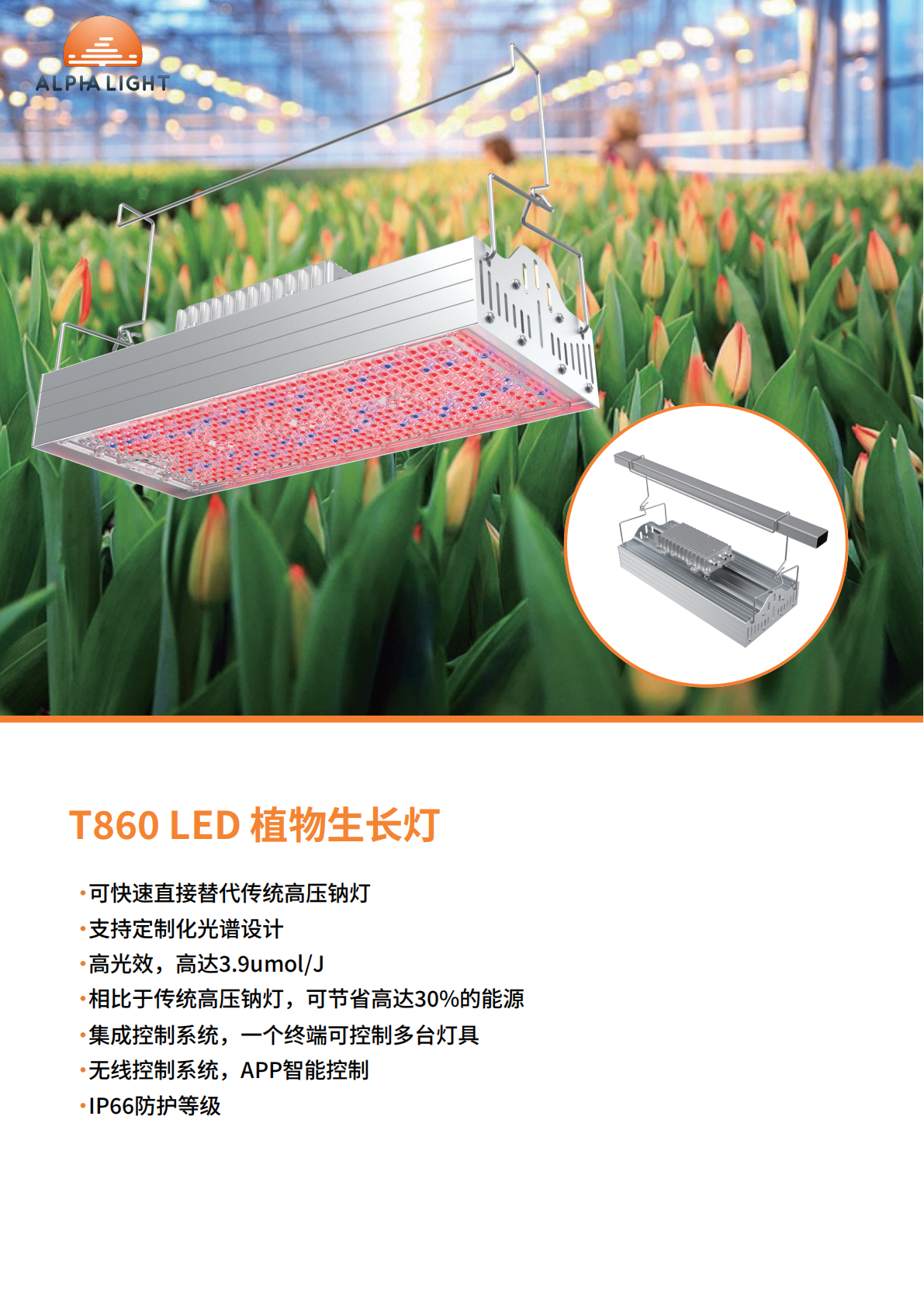 T860 LED 植物生长灯 ·可快速直接替代传统高压钠灯 ·支持定制化光谱设计 ·高光效,高达4.8umol/J ·相比于传统高压钠灯,可节省高达30%的能源 ·集成控制系统,一个终端可控制多台灯具 ·无线控制系统,APP智能控制 ·IP66防护等级